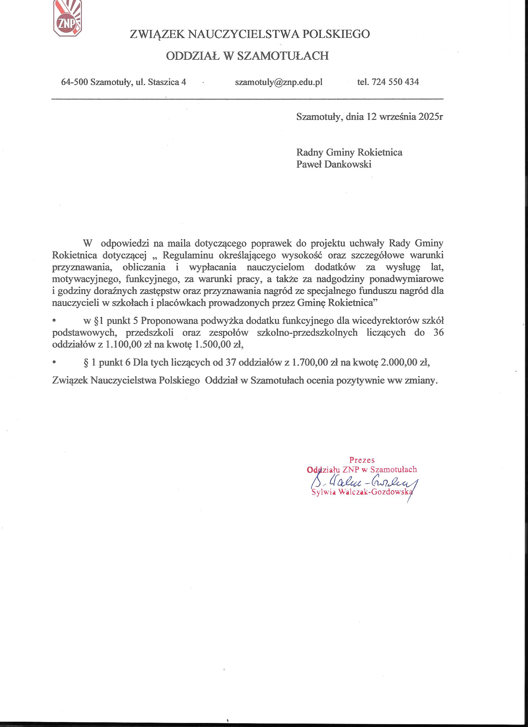 opinia o projekcie uchwały w sprawie: zmiany uchwały Nr LXI/511/2022 Rady Gminy Rokietnica z dnia 19 grudnia 2022 w sprawie: ustalenia ,,Regulaminu określającego wysokość oraz szczegółowe warunki przyznawania, obliczania i wypłacania nauczycielom dodatków za wysługę lat, motywacyjnego, funkcyjnego, za warunki pracy a także za godziny ponadwymiarowe i godziny doraźnych zastępstw, oraz przyznawania nagród ze specjalnego funduszu nagród dla nauczycieli w szkołach i przedszkolach prowadzonych przez Gminę Rokietnica”